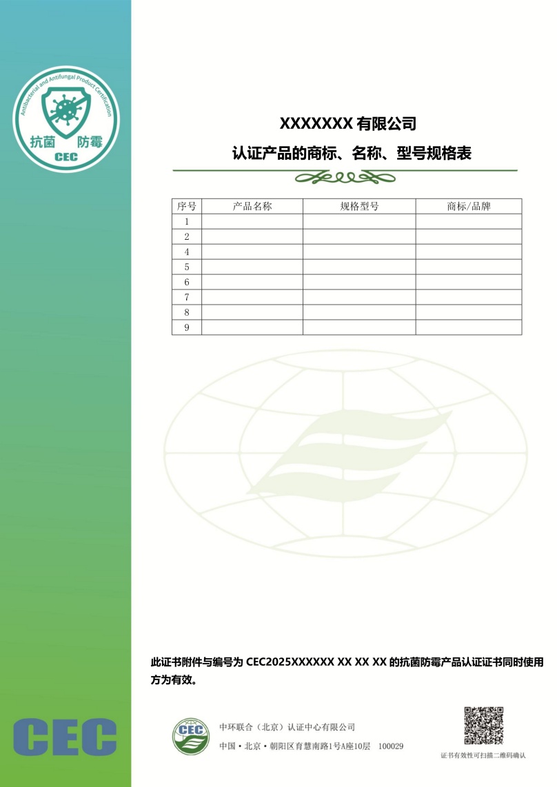 抗菌防霉產品認證證書模版