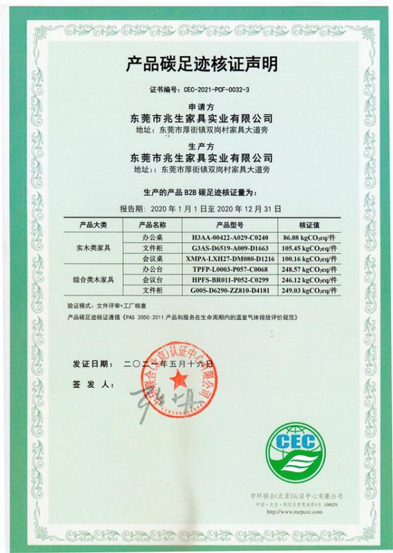 下一篇:東莞市兆生家具實業有限公司碳足跡證書-CEC-2021-PCF-0032-2 -鋼木家具+軟體家具