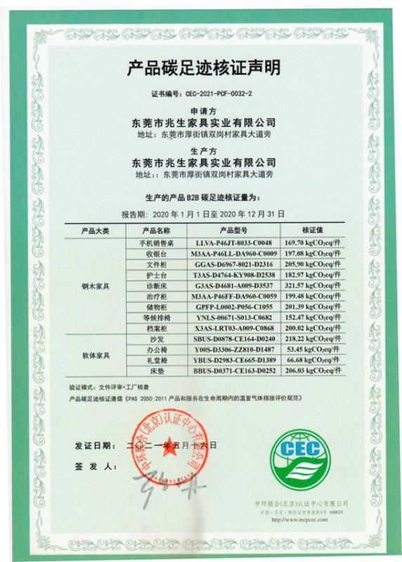 下一篇:東莞市兆生家具實(shí)業(yè)有限公司碳足跡證書(shū)-CEC-2021-PCF-0032-1-人造板類(lèi)家具+鋼木家具