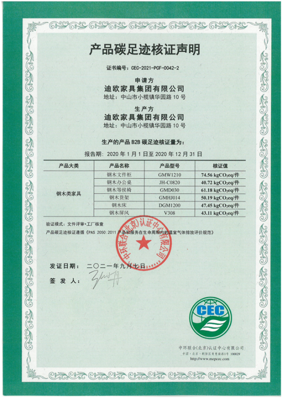 上一篇:迪歐家具集團有限公司碳足跡核證聲明-CEC-2021-PCF-0042-1-人造板類家具