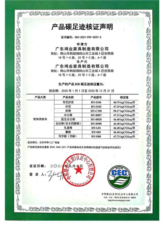 下一篇:廣東省鴻業(yè)家具制造有限公司碳足跡核證聲明-CEC-2021-PCF-0037-2-金屬類鋼木類綜 合類木家具
