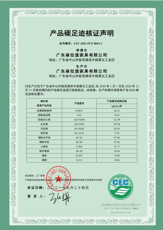上一篇:廣東森拉堡家具有限公司碳足跡證書-CEC-2021-PCF-0043-2-軟體類家具