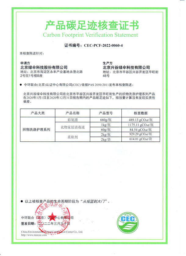 下一篇:北京興谷綠傘科技有限公司-CEC-PCF-2022-0060-3-織物洗滌護理系列