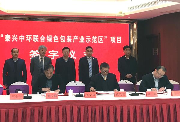 會議期間,在泰興市常務副市長劉榮華、塑包委黃玉彬副主任和陳軼群副總經理及各位與會專家的見證下,中環聯合總經理助理曹磊與泰興市城區工業園區管委會主任常小平、塑包委秘書長安毅共同簽署“泰興中環聯合綠色包裝產業示范區”項目合作協議。