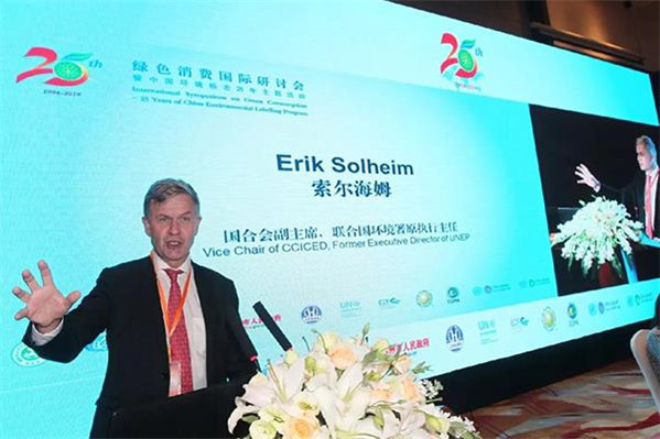 國合會副主席、聯合國環境署原執行主任索爾海姆發表題為“可持續消費與生態文明”的特邀報告。索爾海姆在特邀報告中講到,隨著全球化進程的不斷深入,共謀全球生態文明、建設清潔美麗世界是推動構建人類命運共同體的關鍵舉措,符合世界綠色發展潮流和各國人民共同意愿。他提出了四個方面關注,即關注經濟社會發展實現從量到質的轉化;關注從傳統經濟到循環經濟模式轉變;關注形成產品轉向服務的升級模式;關注從棕色經濟向綠色經濟轉型。