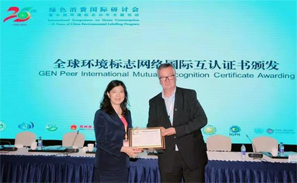 10月25日,“綠色消費國際研討會暨中國環境標志25年主題活動”(以下簡稱主題活動)在蘇州市舉行。本次主題活動由生態環境部環境發展中心主辦,中環聯合認證中心承辦,并得到了蘇州市人民政府、中國環境與發展國際合作委員(CCICED)會秘書處、聯合國環境規劃署(UNEP)駐華代表處、美國環保協會(EDF)、全球環境標志網絡(GEN)和國際綠色采購網絡(IGPN)的大力支持。主題活動旨在交流國內外綠色消費優秀實踐經驗,研討“十四五”綠色消費的戰略、任務與措施;總結回顧中國環境標志計劃25年來砥礪前行的心路歷程和豐碩成果,研討全面深入推進的舉措;對推動和踐行綠色消費的利益相關者發揮宣傳引導作用。來自中國環境與發展國際合作委員會、國家市場監督管理總局、財政部、蘇州市人民政府等相關部門的領導,相關行業協會、科研檢驗機構、NGO組織、獲證企業代表,以及全球環境標志網絡(GEN)、聯合國環境規劃署(UNEP)、美國環保協會(EDF)、國際綠色采購網絡(IGPN)、多個國家和地區環境標志組織代表300余人參加了本次會議。