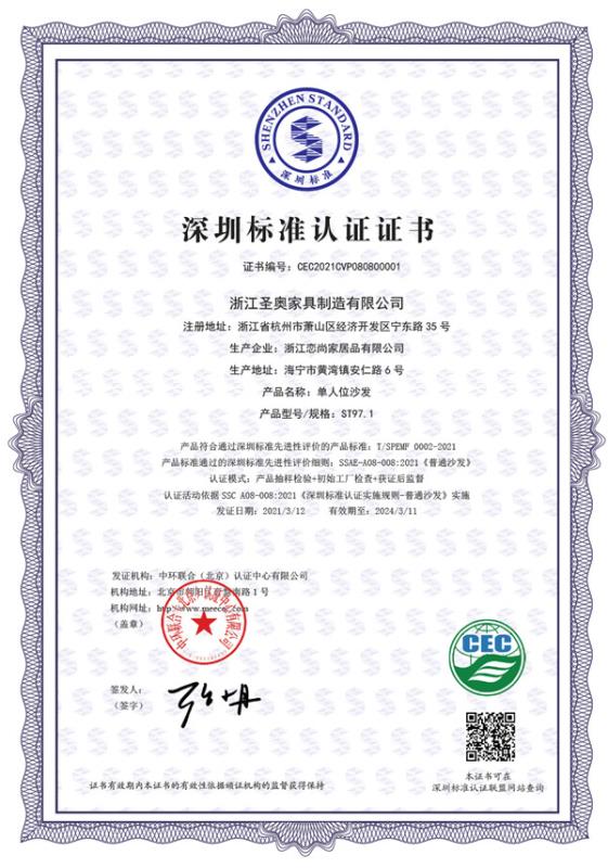 2021年初,深圳市向全國開放“深圳標準認證”申請,該項工作首先在家具行業試點。中環聯合認證中心(以下簡稱中環聯合)作為國內領先的環保、節能和低碳領域的綜合性認證與服務機構,借助在家具行業多年開展環保類產品認證的豐富經驗,獲得了首批面向全國家具行業開展“深圳標準認證”的認證機構資質。經過精細的準備、合理的策劃和嚴格的審核,中環聯合完成了首批家具企業的深圳標準認證工作,并于2021年3月15日向浙江圣奧家具有限公司等7家企業簽發了首批“深圳標準認證”認證證書。