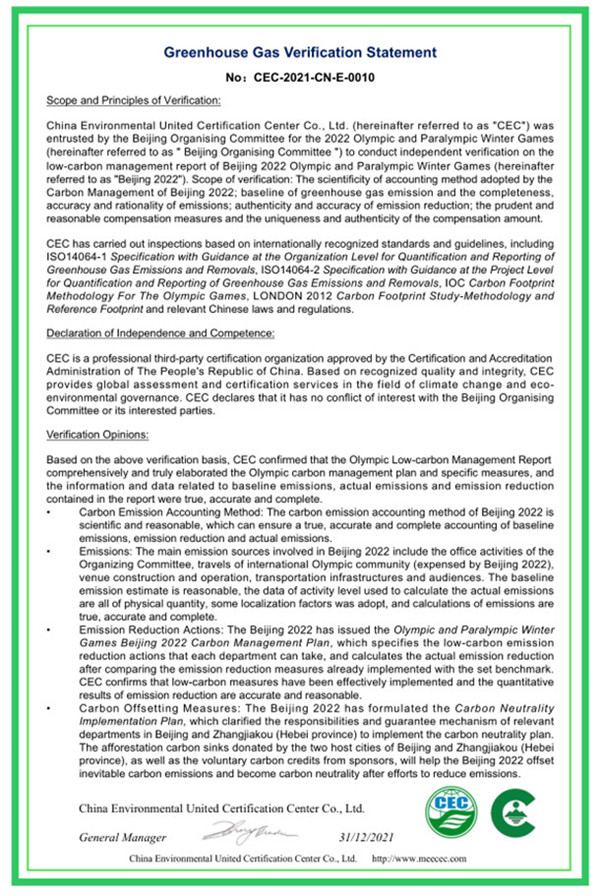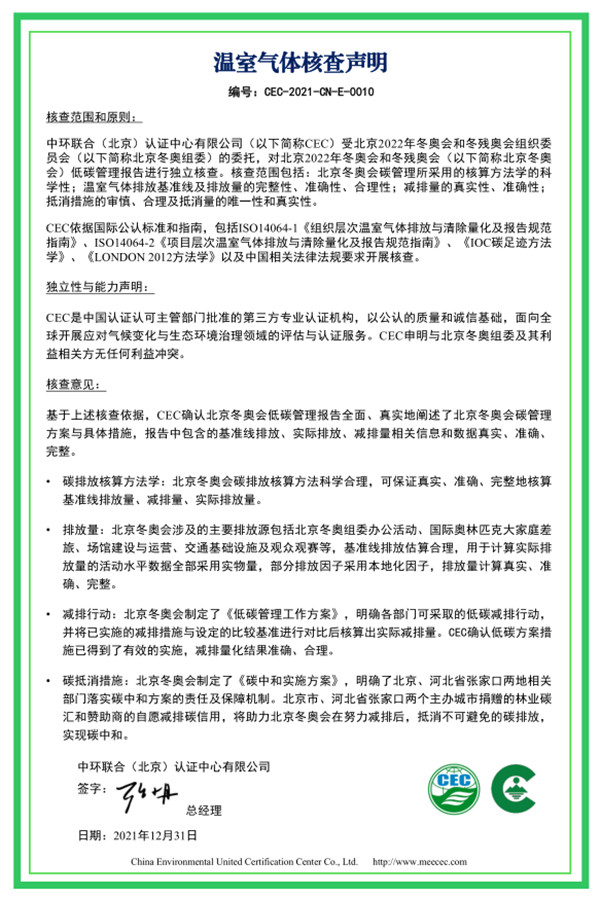 中環聯合認證中心應對氣候變化團隊發揮專業優勢,助力北京冬奧會低碳管理工作順利開展,持續做好低碳冬奧支撐工作,推動北京綠色冬奧為今后大型體育賽事提供有益借鑒,將北京綠色冬奧打造成一張推進京津冀協同綠色發展、助力我國實現“雙碳”目標的亮麗名片。