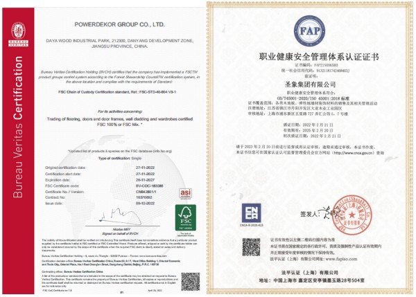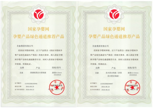圣象集團(tuán)及所屬工廠(chǎng)先后通過(guò)FSC森林認(rèn)證、ISO9001質(zhì)量管理體系、ISO14001環(huán)境管理體系、職業(yè)健康安全管理體系的認(rèn)證,圣象產(chǎn)品獲得國(guó)家孕嬰網(wǎng)孕嬰產(chǎn)品綠色通道推薦產(chǎn)品、環(huán)境標(biāo)志認(rèn)證產(chǎn)品、綠色產(chǎn)品、綠色無(wú)醛添加型等證書(shū)。