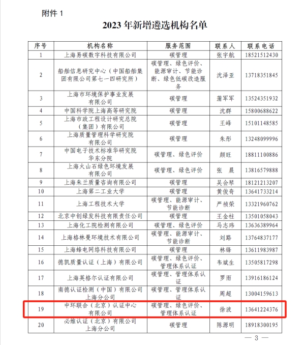 2023年11月20日,上海市經(jīng)濟(jì)和信息化委員會發(fā)布了《上海市經(jīng)濟(jì)信息化委關(guān)于公布2023年度上海市綠色低碳服務(wù)機(jī)構(gòu)遴選名單的通知》(滬經(jīng)信節(jié)【2023】1006號),中環(huán)聯(lián)合(北京)認(rèn)證中心有限公司(以下簡稱CEC)成功入選,成為上海市碳管理、綠色評價、管理體系認(rèn)證的第三方服務(wù)機(jī)構(gòu)。