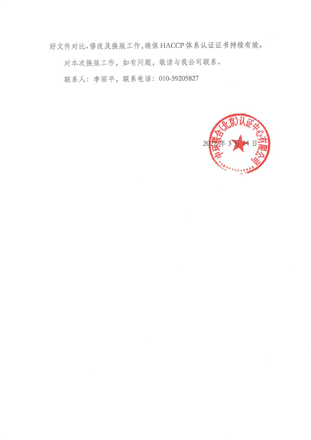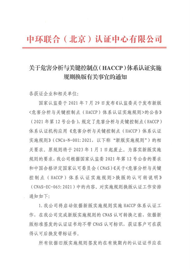 關于危害分析與關鍵控制點(HACCP)體系認證實施規則換版有關事宜的通知